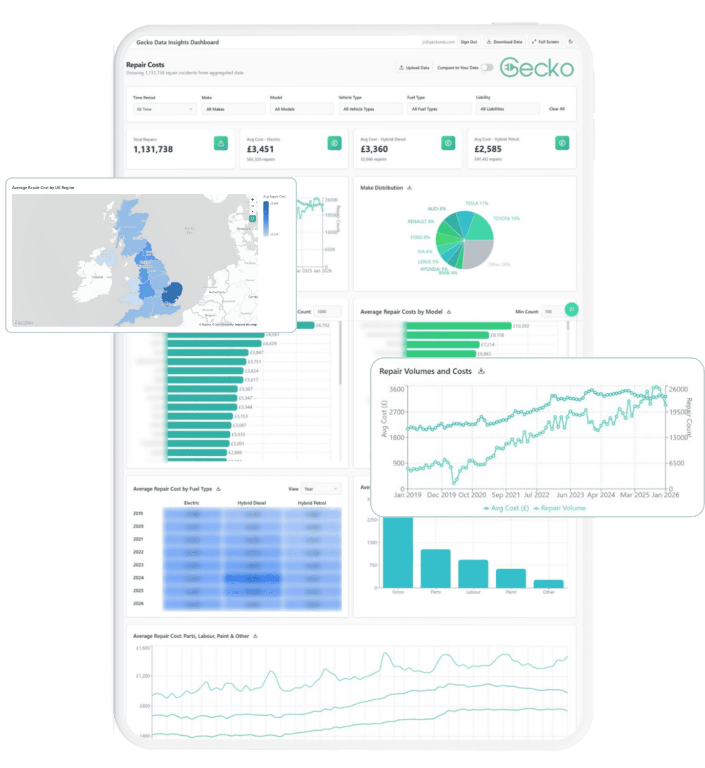 Gecko’s bespoke data dashboards provide clear, actionable insights into your EV exposure, enabling you to benchmark your performance against the wider UK market. From claims frequency and severity to make and model level trends, Gecko delivers the insights you need to make informed decisions.