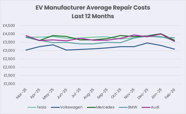 Repair costs for all five tracked manufacturers moved down in February. Audi saw the most extreme change, reducing by over 11%, and with Tesla we saw more volatility than we have seen from them in 12 months, with average repair costs reducing by 6.9%.