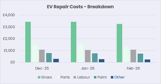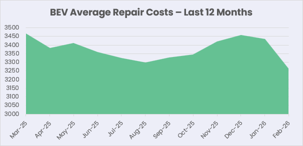 BEV average repair costs came down across the board in February. There are caveats, in that it’s a particularly short month and we are due to realise some of the lengthier more expensive repairs that will surely edge up the costs for February in due course.