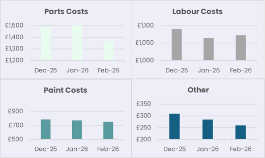 A further underlying reason for repair costs coming down is that average Parts Costs have come down by more 10% month-on-month. Looking back at our historic data, this is a trend we have seen every year in February for the last 5 years. We understand this is due to initial seasonal repairer backlogs clearing, making parts easier to source and lower in cost. Labour and Paint costs have stayed relatively flat moving from January to February.