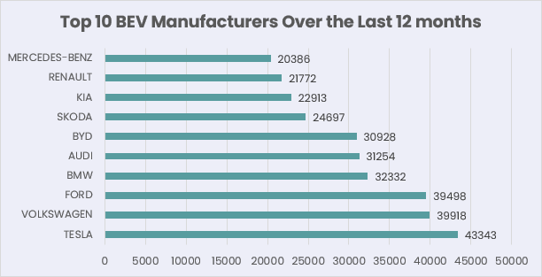For the first time in a long time, there has been no change to the top 10 BEV manufacturers over the last 12 months. Hardly surprising, given the modest number of new registrations in February. One notable area of change is Ford being neck and neck with Volkswagen in 3rd and 2nd respectively. This time last year, Ford did not feature in the top 10 manufacturers at all and less surprisingly BYD were also nowhere to be seen when looking back 12 months from Feb 2025.