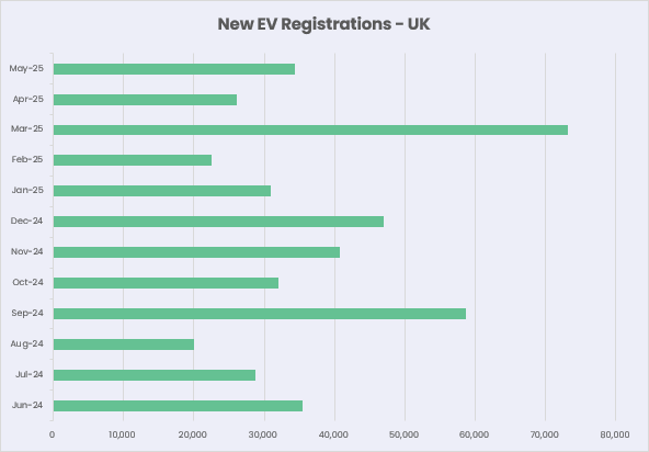 There were 34,393 new BEV registrations in May, which was a 31% increase on the previous month. Legacy manufacturers make up the top 5 OEMs for new registrations for last month, with three of them being Volkswagen brands (Volkswagen, Audi, Skoda).