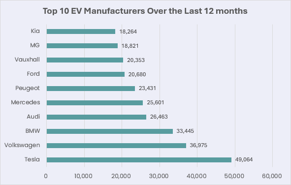 Tesla are up to 6th place which is marked improvement on the previous month, and they remain by some distance the most popular make over the last 12 months with 49,064 new registrations. This is 12,000 more than their nearest rival; Volkswagen.