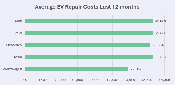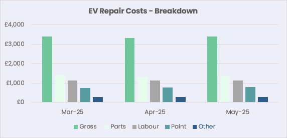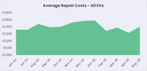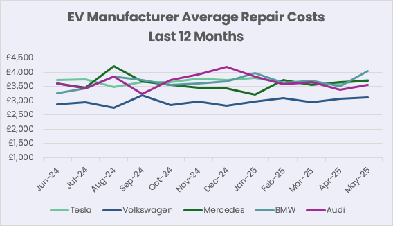 We have reported in previous months that Chinese manufacturers such as BYD and MG appear on the face of it to be an attractive risk due to comparatively low repair costs. Write offs and residual value plays a part in this and therefore it is worth highlighting that for a comparatively more expensive make, Volvo appears to have a relatively low average repair cost of under £3,000 over the course of the last year. Their compatriot manufacturer, EV specialist manufacturer Polestar (previously owned by Volvo) also seems to hold repair costs of a lower severity compared to similarly priced vehicles.
